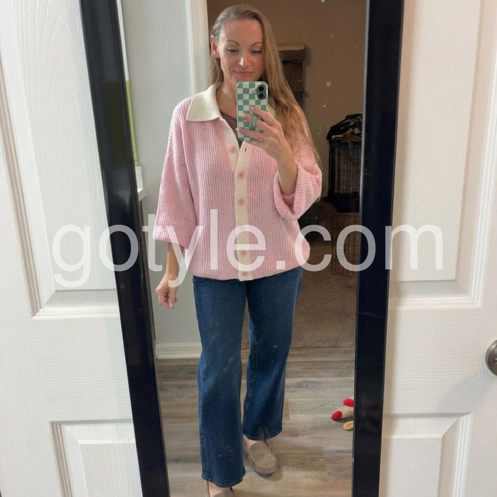 This sweet pink collared long sleeve cardigan is the perfect addition to any wardrobe. Made from high-quality materials, it offers both comfort and style. Its versatile design allows for easy pairing with any outfit, making it a must-have for any fashion enthusiast. Embrace comfort and sophistication with this cozy sweater.