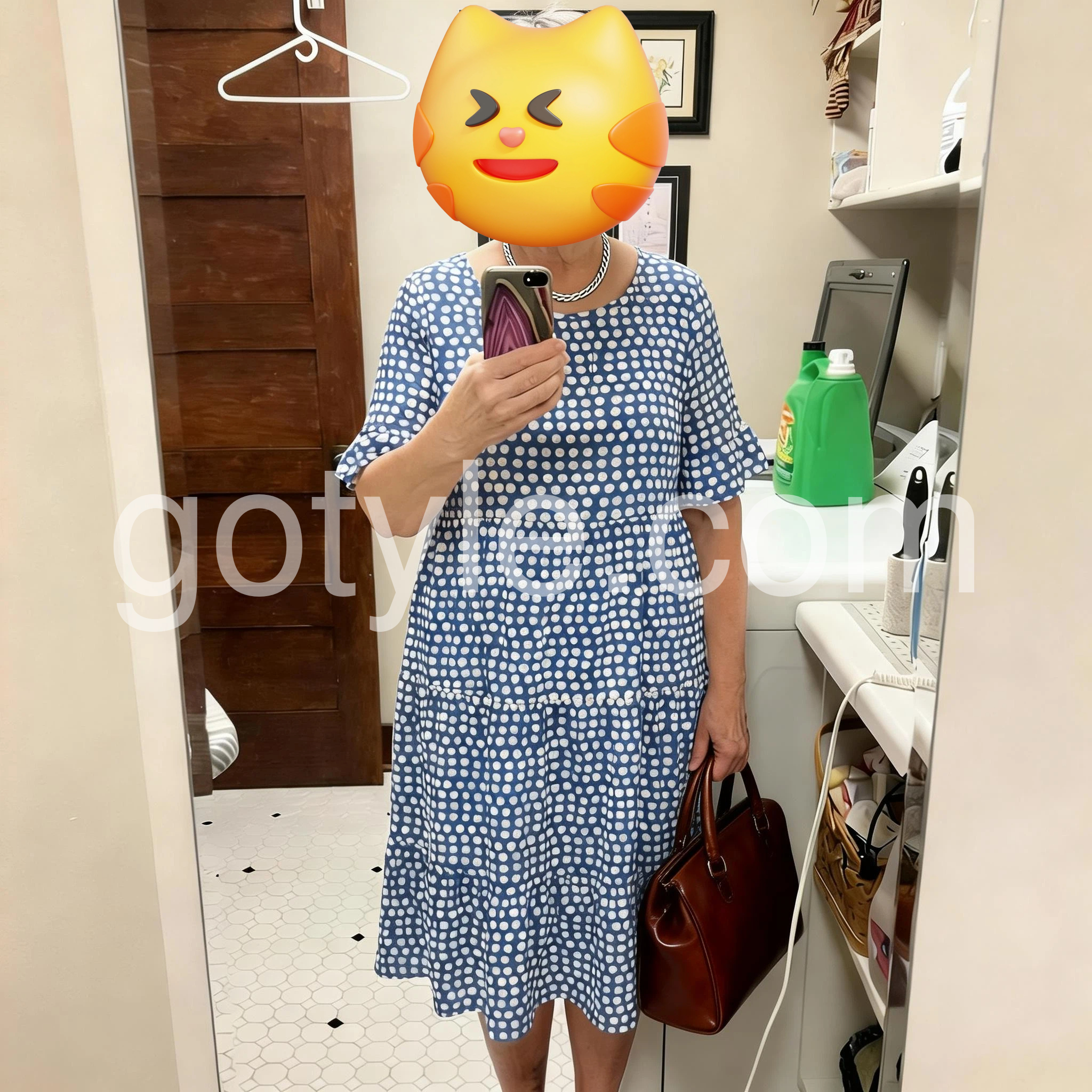 I love how effortless this dress looks while still feeling stylish. The fabric is light and breathable, and the relaxed cut is flattering in all the right ways—it skims my body instead of clinging. The blue-and-white dotted print is so classic. With a straw bag and simple sandals, it’s the perfect outfit for a getaway or a sunny day out.