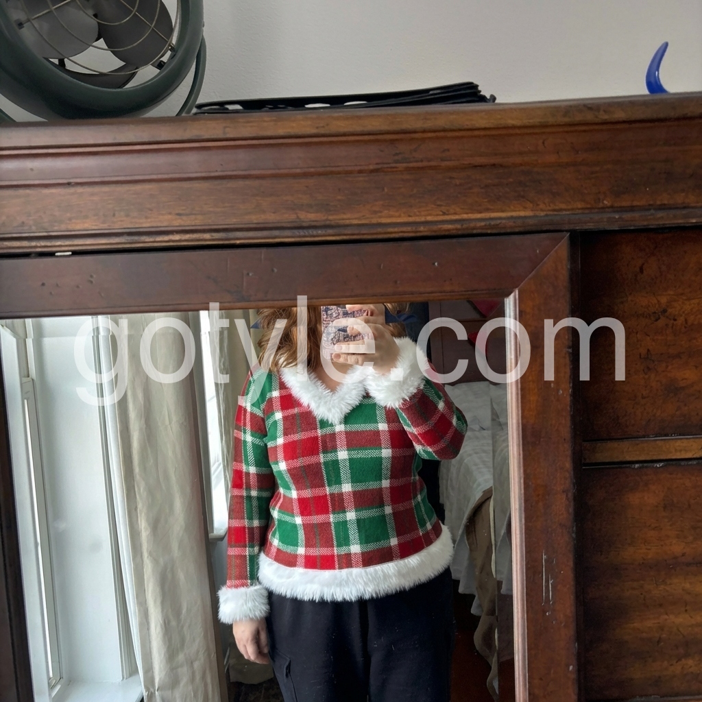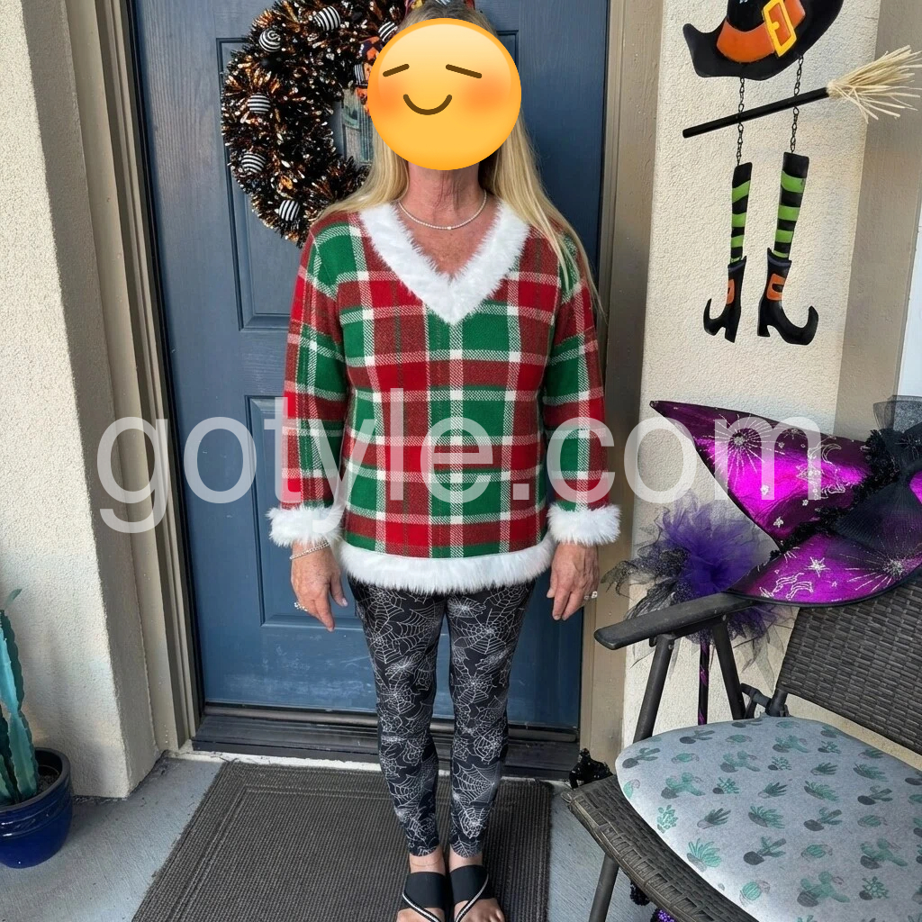 Festive Green Plaid Christmas Top with Faux Fur Trim
