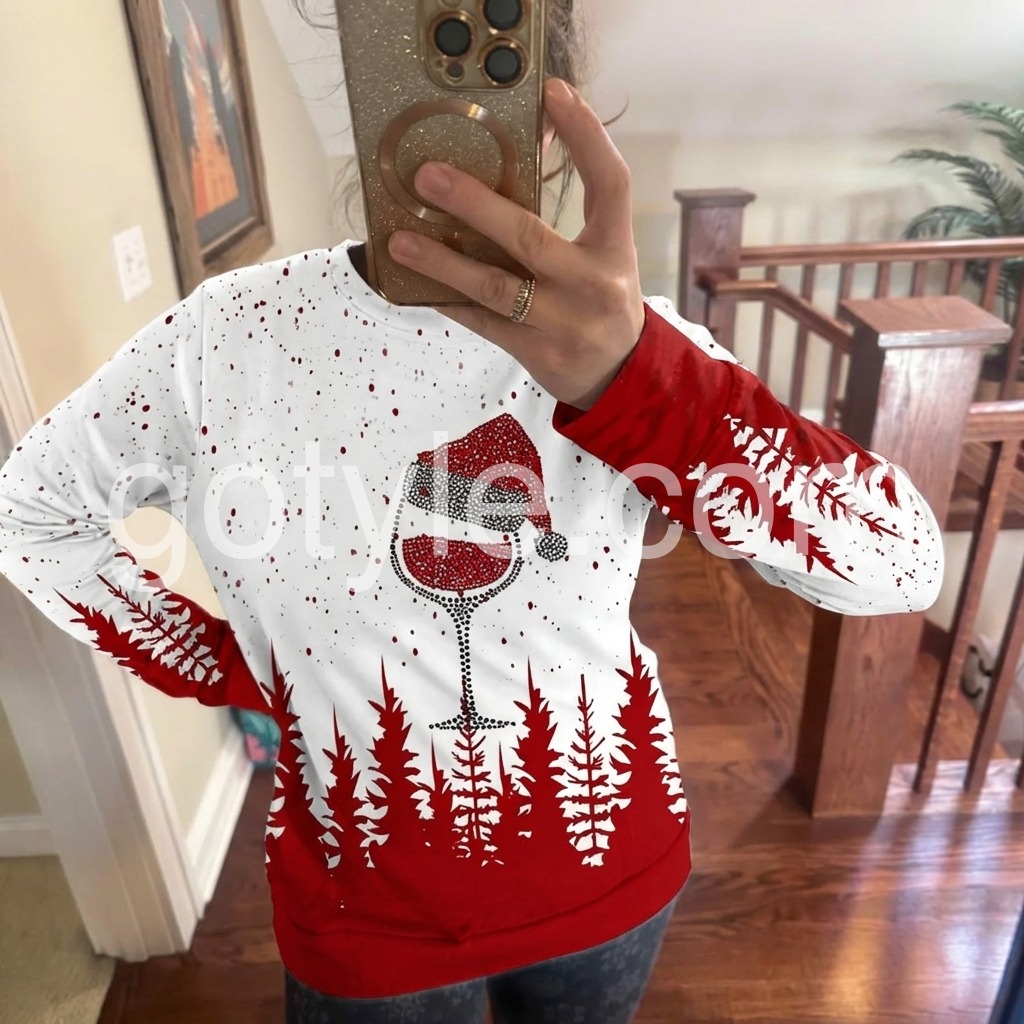 Bottoms up with this vibrant Christmas top featuring a sparkling printed tipsy red wine glass and Santa hat, making it perfect for wearing to any holiday party. Spread the cheer near and dear with red pine trees/Christmas trees in a silhouette, accentuating this super-cute design. Long sleeves and a waist-length fit keep you cozy.