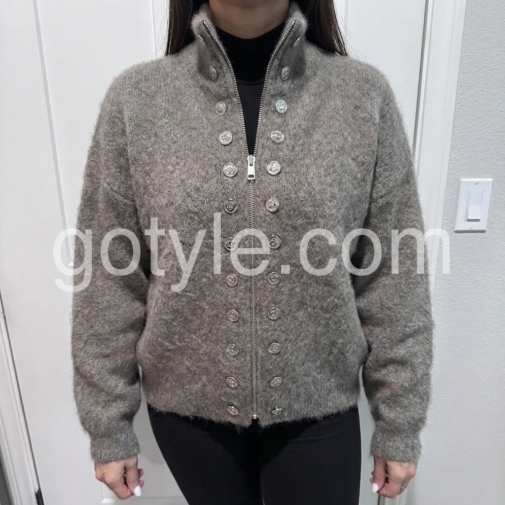 The Fuzzy Grey High Neck Long Sleeve Cardigan is a cozy and stylish addition to any wardrobe. Made with a high neck and long sleeves, it provides warmth and comfort during colder months. The fuzzy texture adds a touch of softness and style, making it a versatile piece for any outfit.