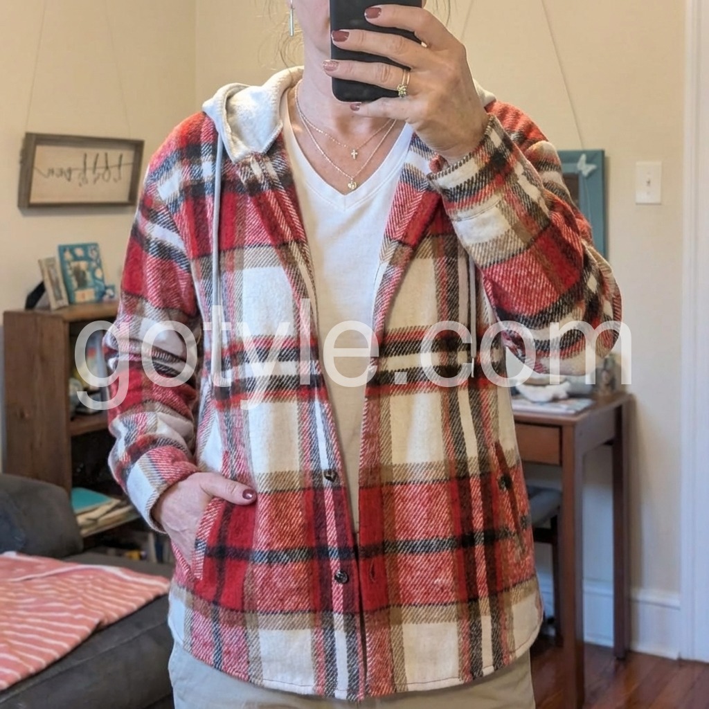 This jacket is great! It is perfect to wear on cooler days - not too thick and definitely not thin. It is very soft and the plaid pattern is stunning! Very comfy!!