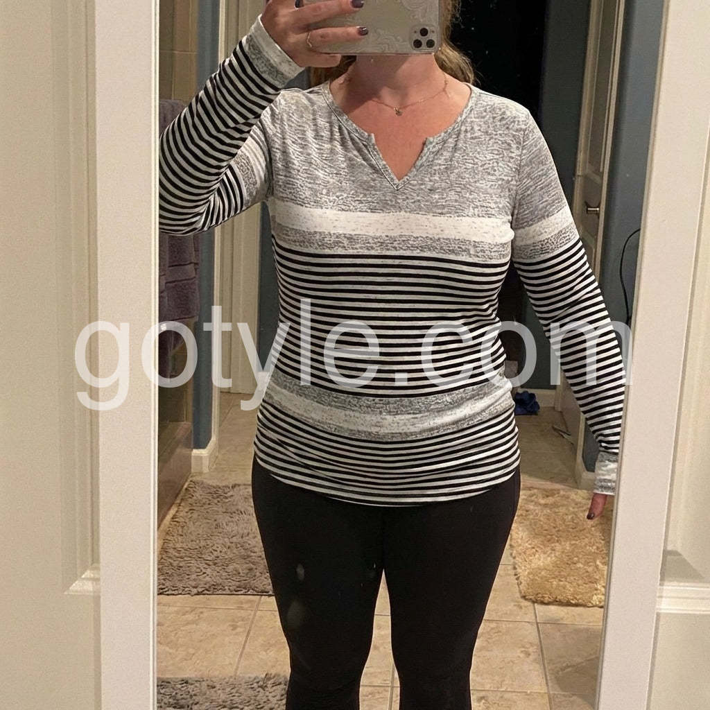 Fits perfectly and true to size. The v-neck isn't too low, which I appreciate. The long sleeves make it perfect for fall weather. I've received so many compliments on the heathered grey and stripe combination.