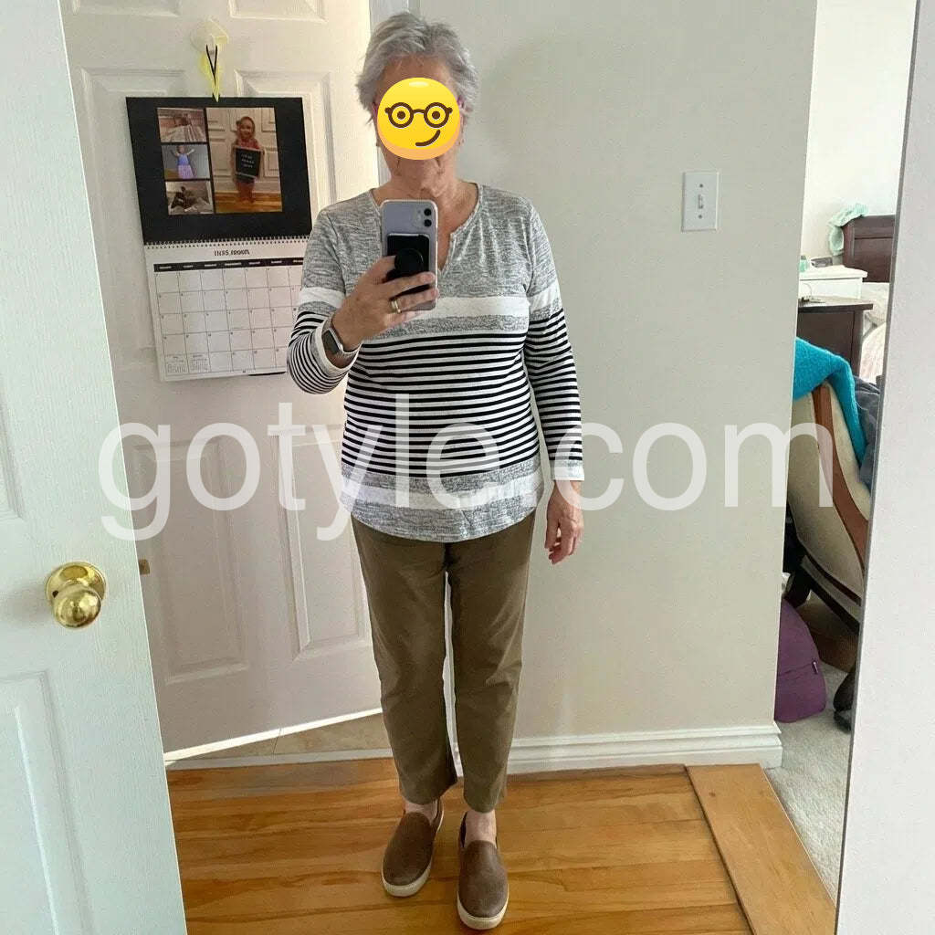 I absolutely love this top! The color block design with the stripes is so unique and flattering. The material is very soft and comfortable for all-day wear. It looks great paired with my favorite jeans.