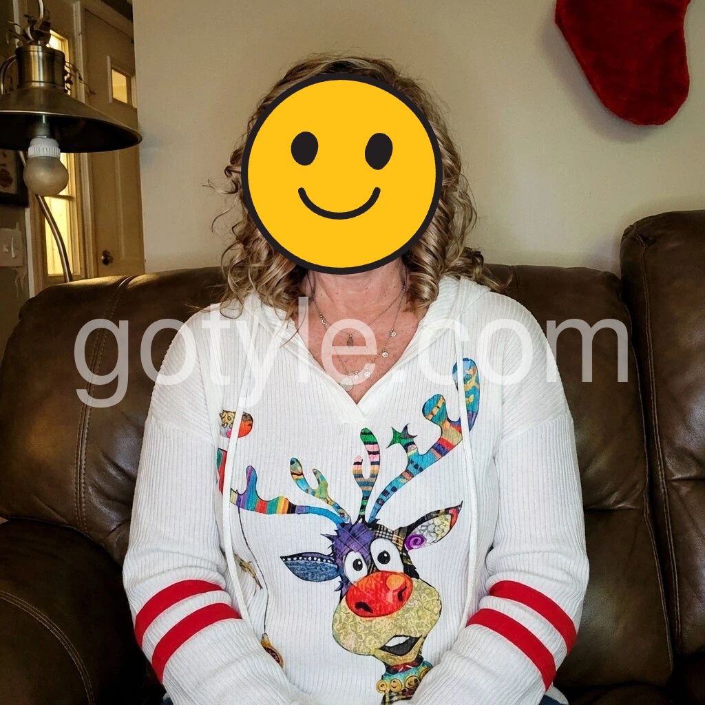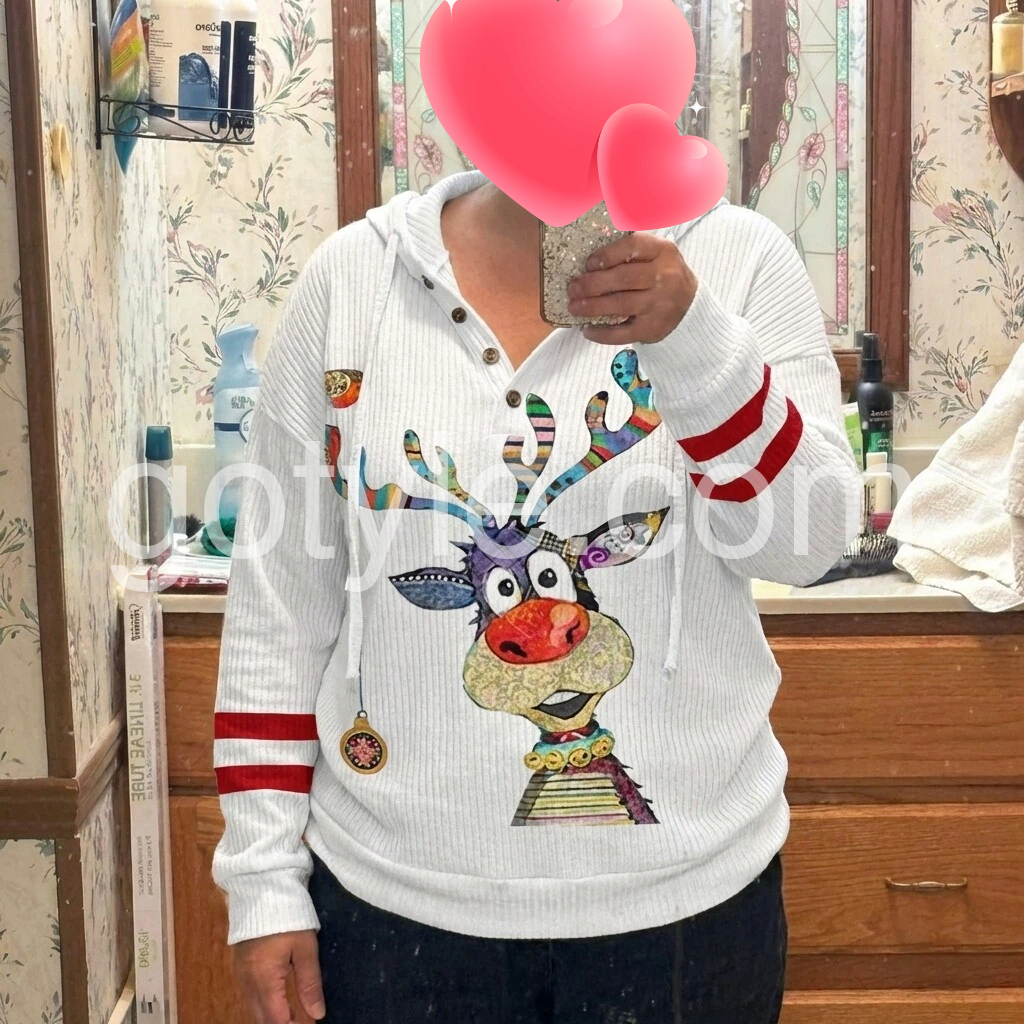 Bring in the winter season with this holiday-ready reindeer top. A white cozy ribbed top with red stripes and colorful reindeer print make this hoodie a cheerful complement to your day or night with its relaxed vibe.  A plunging v-neck and buttons on the front give it the perfect amount of detail and chic fit.